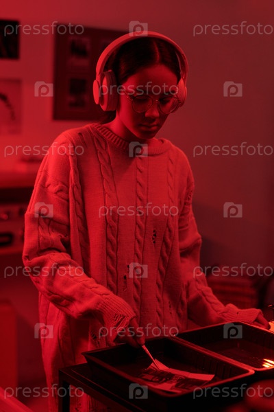 Женщина-фотограф разрабатывает фотопринты в темной комнате