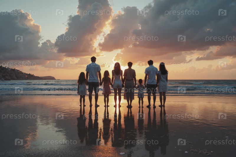 Большая семья наслаждается закатом солнца на пляже в течение лета