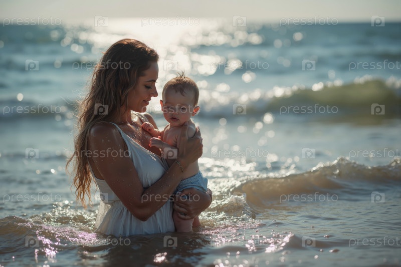 Мать держит ребенка, стоя в океанических волнах