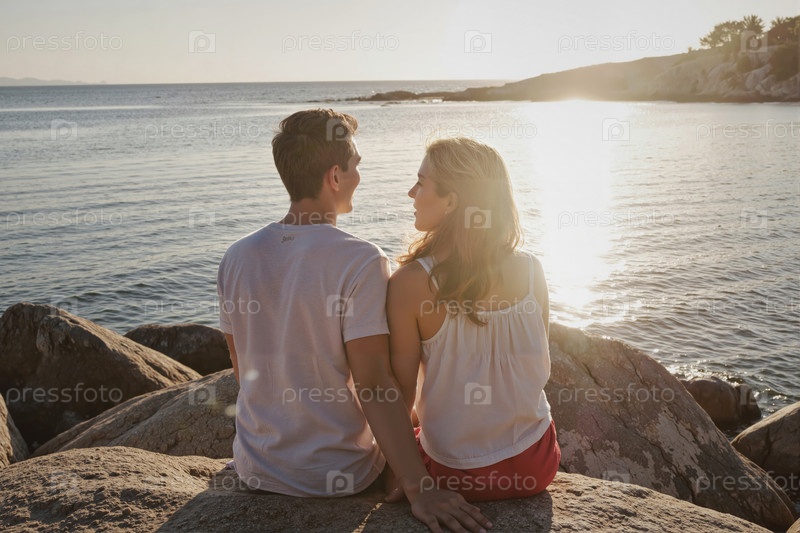 Пара, сидящая на скалах с видом на спокойный океан