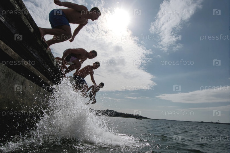 Дети прыгают с деревянного пирса в океан, брызгая воду