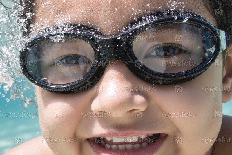 Улыбающийся ребенок, носящий очки в чистой воде