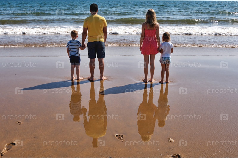 Семья наслаждается днем на пляже, держась за руки