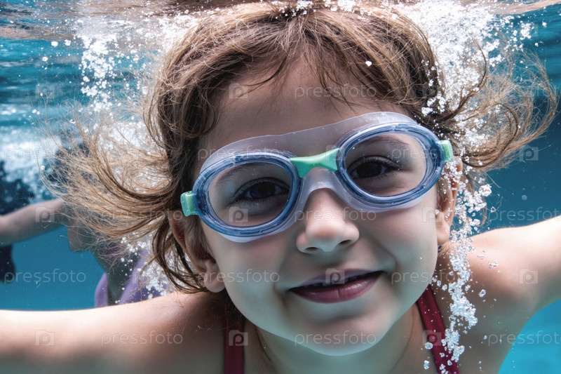 Улыбающийся ребенок наслаждается плаванием под водой в бассейне
