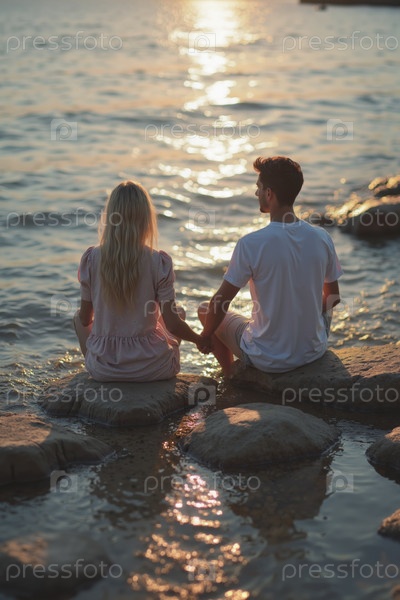 Смотреть закат вместе на скалистой береговой линии
