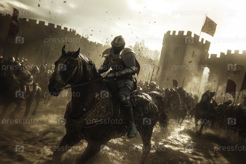 Средневековый рыцарь верхом на лошади во время осады битвы