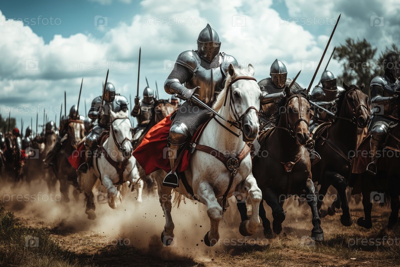 Рыцари, разгоняющиеся верхом на лошадях в средневековой сцене битвы