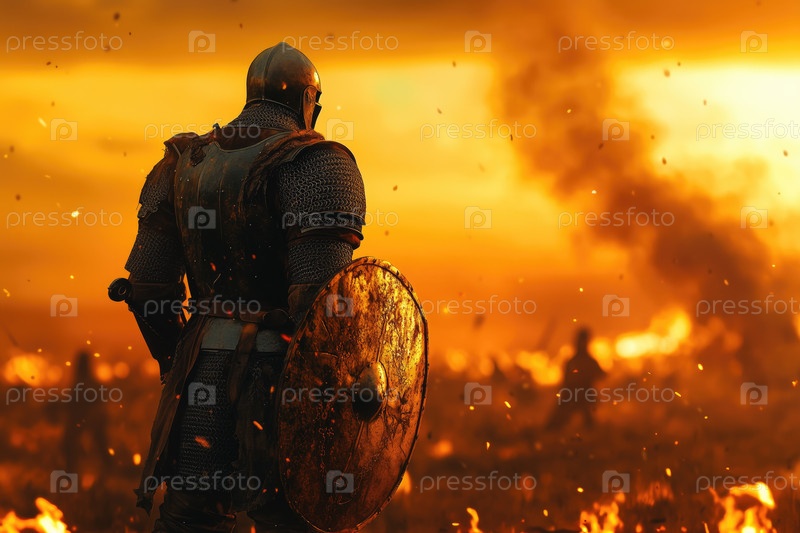 Воин, стоящий высоко среди пылающей сцены битвы