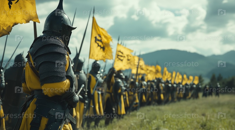 Марширующие средневековые рыцари в полной доспехах, держащие знамена