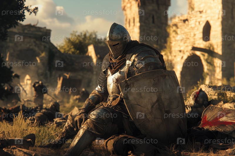 Рыцарь отдыхает после интенсивной битвы, держащий щит