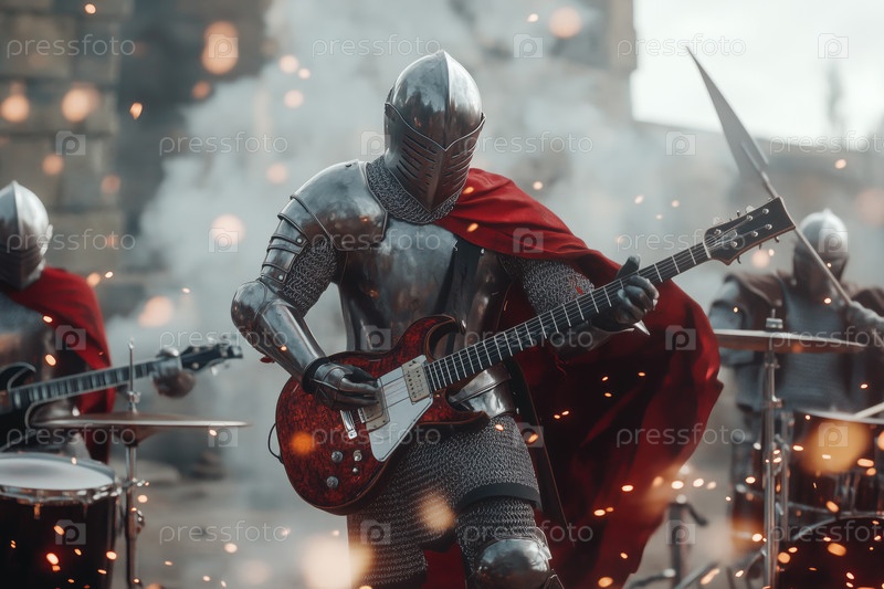 Средневековые рыцари играют на электрической гитаре в боевой брони