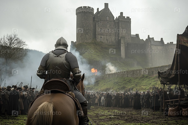 Рыцарь на коне приближается к Каменному замку среди солдат