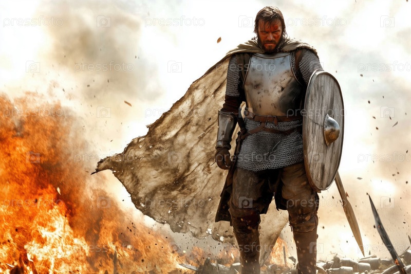 Смелый средневековый рыцарь на поле битвы в огне