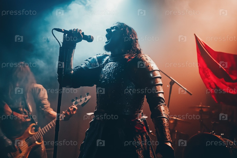 Рыцарь в доспехах выступает на сцене, поёт