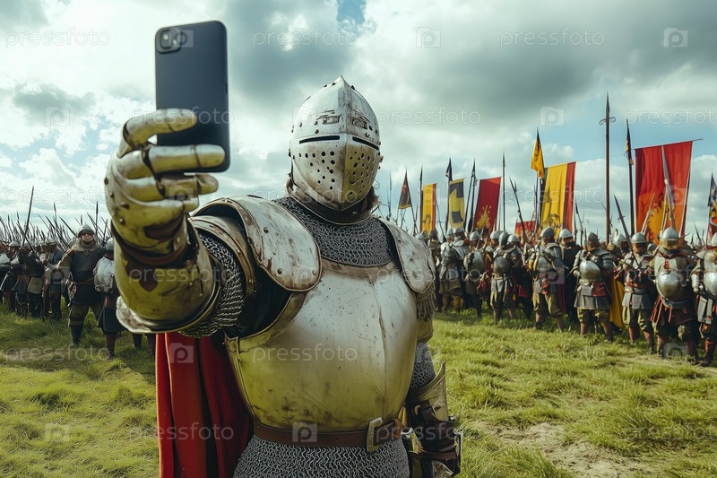 Средневековый рыцарь делает селфи во время отдыха на поле битвы