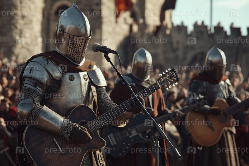 Исполнение гитары во время средневекового фестиваля в бронированном костюме