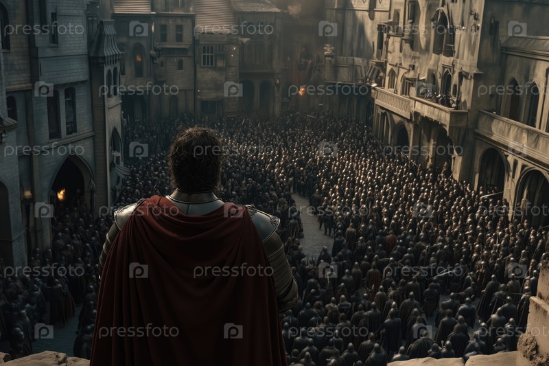С видом на средневековую городскую площадь, заполненную собирающейся толпой