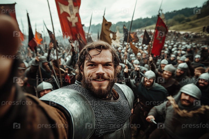 Улыбающийся средневековый солдат делает селфи во время битвы