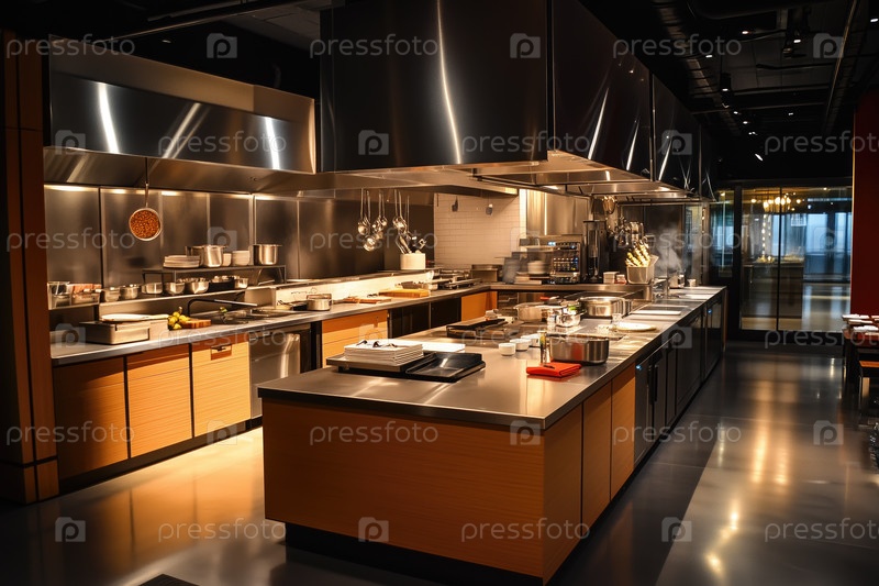 Блестящая профессиональная кухня с современным оборудованием