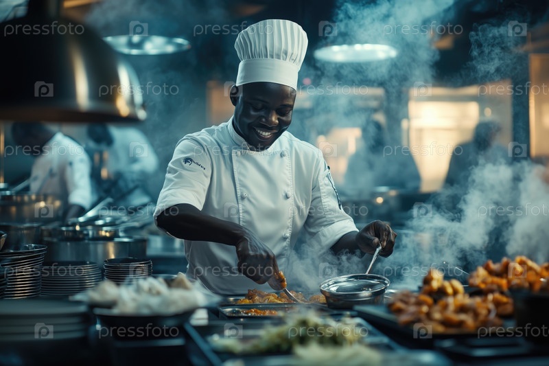 Ношение шляпы приготовление блюда в профессиональной кухне шеф-повар