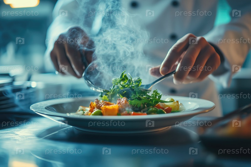 Гарнизирующая вкусная парящая тарелка еды шеф-повара