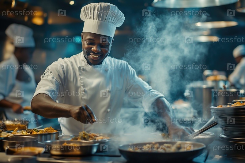 Улыбающийся шеф-повар готовит еду на занятой кухне ресторана