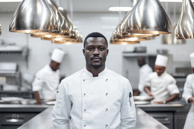 Портрет афроамериканского повара, стоящего на профессиональной кухне