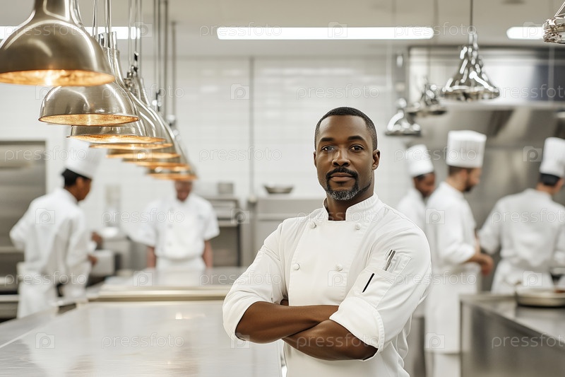 Портрет улыбающегося повара, стоящего на современной кухне