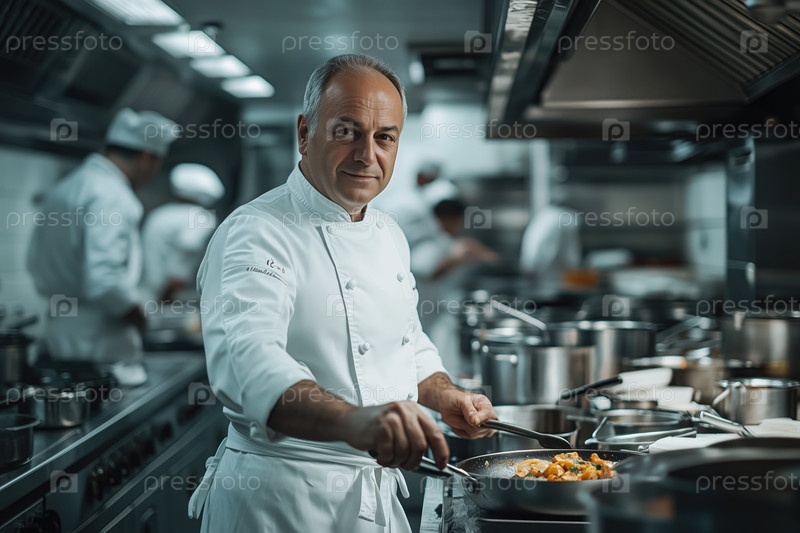Шеф-повар, готовящий в занятой ресторанной кухне Профессиональный кулинар