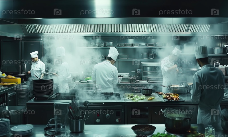Загруженные шеф-повары работают на профессиональной кухне ресторана