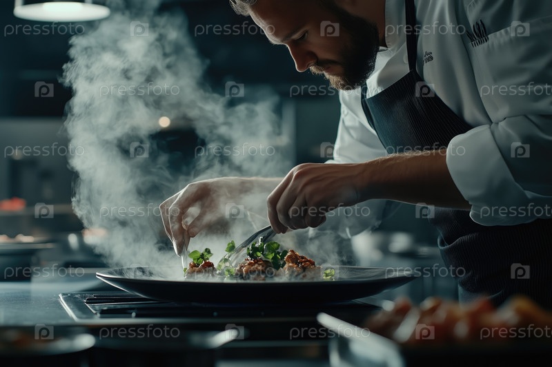 Подготовка гурманского блюда в профессиональной кухне шеф-повар