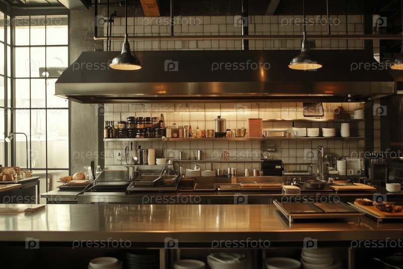 Коммерческая кухня с современным оборудованием из нержавеющей стали