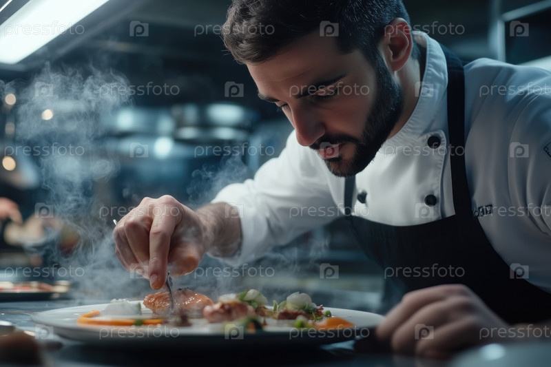 Подготовка гурманской еды на современной кухне с фокусом на шеф-поваре