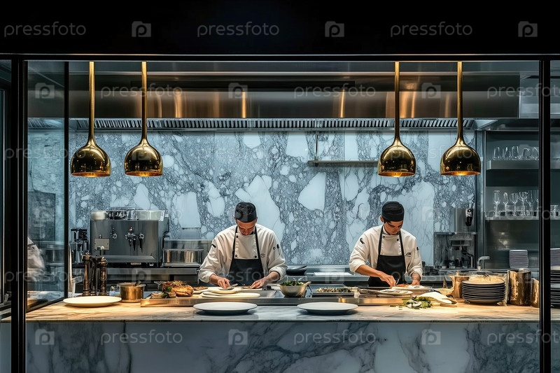 Профессиональные шеф-повары, готовящие гурманские блюда на современной кухне