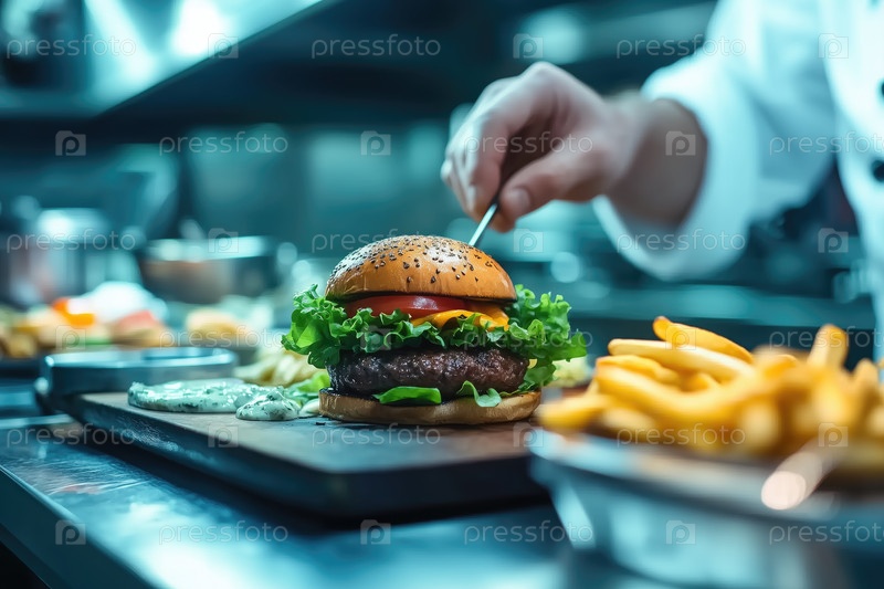 Шеф-повар готовит гастрономический бургер с салатами и томатами