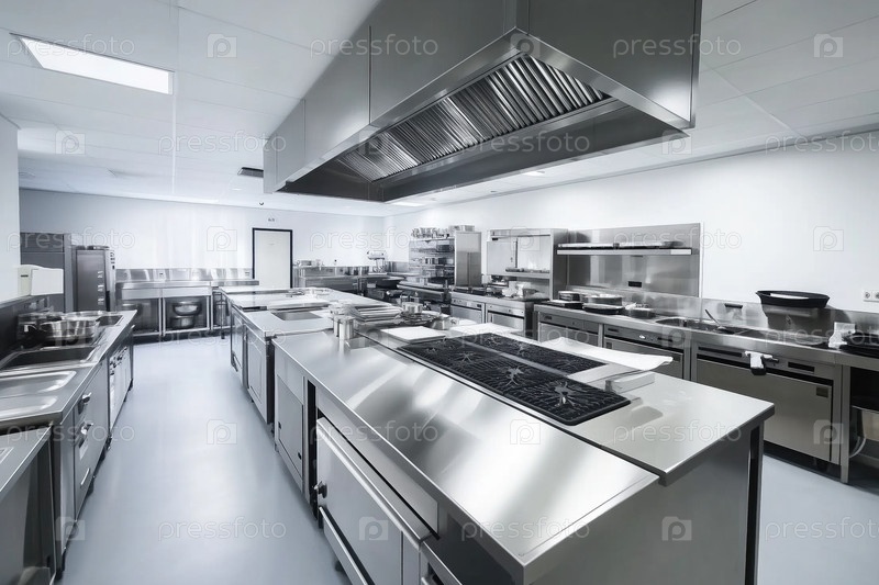Промышленная кухня с современным оборудованием из нержавеющей стали