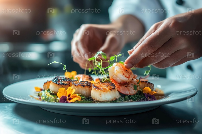 Оформление изысканного блюда с морепродуктами на кухне ресторана