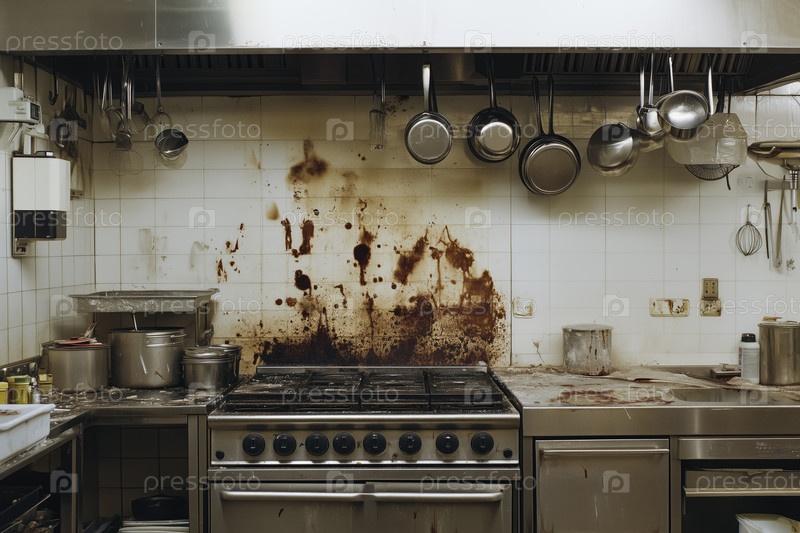 Не ухоженная профессиональная кухня с грязными стенами и плитой