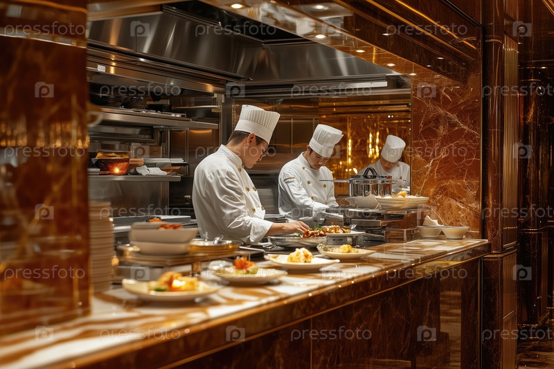 Профессиональные шеф-повары готовят гурматные блюда на роскошных кухнях