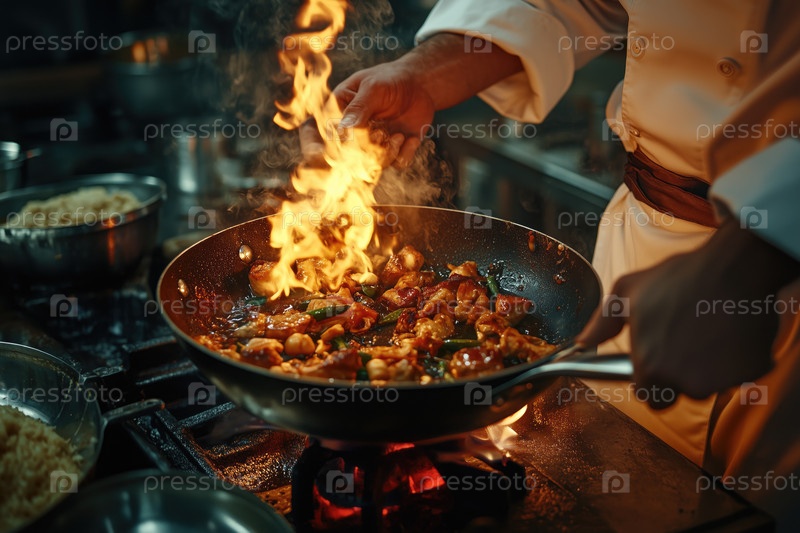 Смешанное жареное блюдо в профессиональной кухне