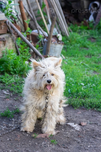 Большая красная цепная собака лежит рядом с деревянной будкой