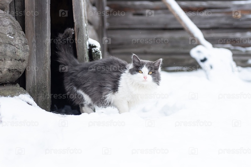 Пушистый серый кот на снегу