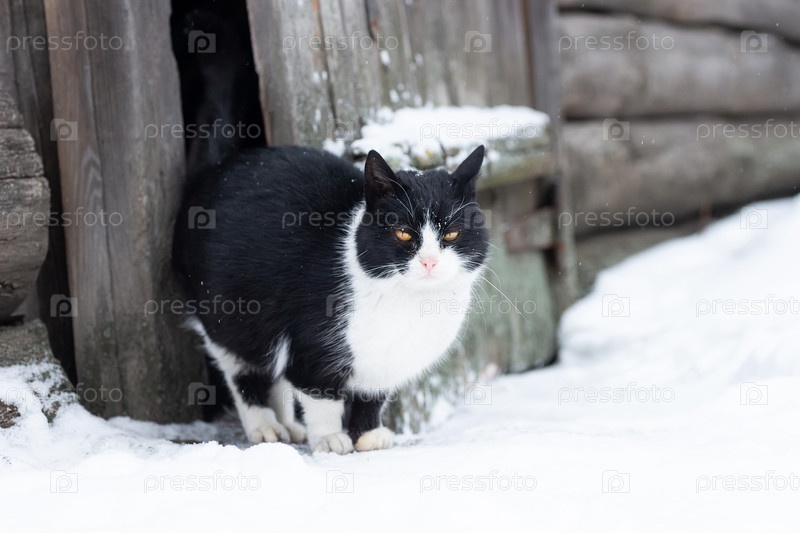 Пушистый серый кот на снегу