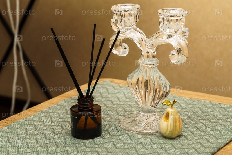 Натюрморт. Подсвечник, аромадиффузор и груша из оникса на столе