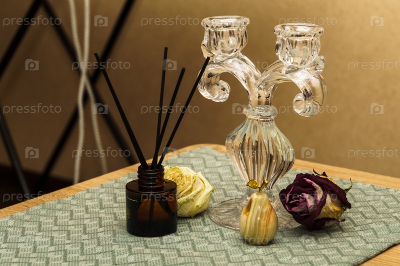 Натюрморт. Подсвечник, аромадиффузор, груша из оникса и засохшие бутоны роз на столе