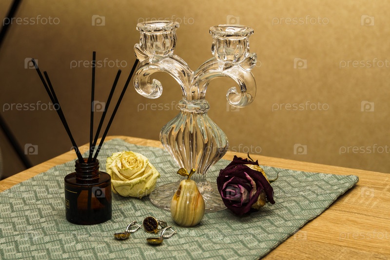 Натюрморт. Подсвечник, аромадиффузор, груша из оникса украшения из граната и засохшие бутоны роз на столе