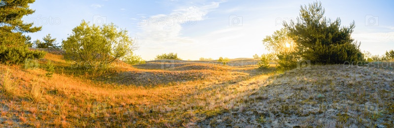 Солнечный восход солнца над равниной, голубое небо с облаками на заднем плане, панорама