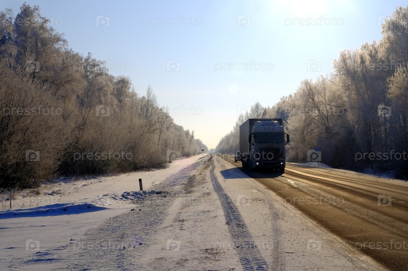 Морозный солнечный день, деревья в иние, движение грузовых автомобилей по дороге