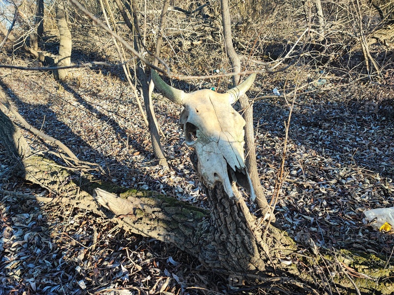 Череп быка в лесу. Кости коровы. Череп крупного рогатого скота в лесу