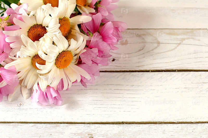 Букет красивых цветов ромашки и мальвы на деревянном солнечном фоне, рекламный баннер весенней и летней продукции, абстрактная цветочная композиция, праздничная открытка с местом для текста, селективный фокус